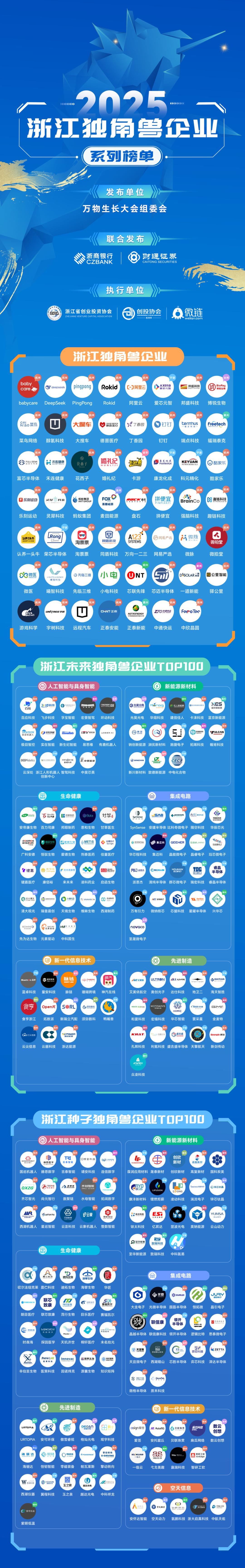 2025年4月24日下午,民建浙江省委会、浙江省工商联、中国投资发展促进会主办的第九届万物生长大会在杭州举办。会上,大会组委会联合战略合作伙伴浙商银行、财通证券首次发布浙江省独角兽企业系列榜单:浙江独角兽企业、浙江未来独角兽企业TOP100、浙江种子独角兽企业TOP100,全省发掘独角兽梯度企业。