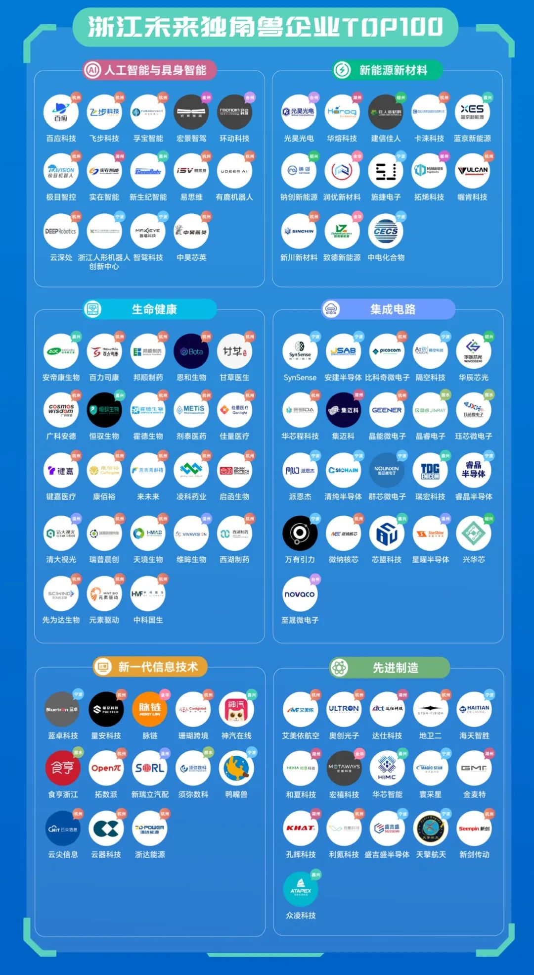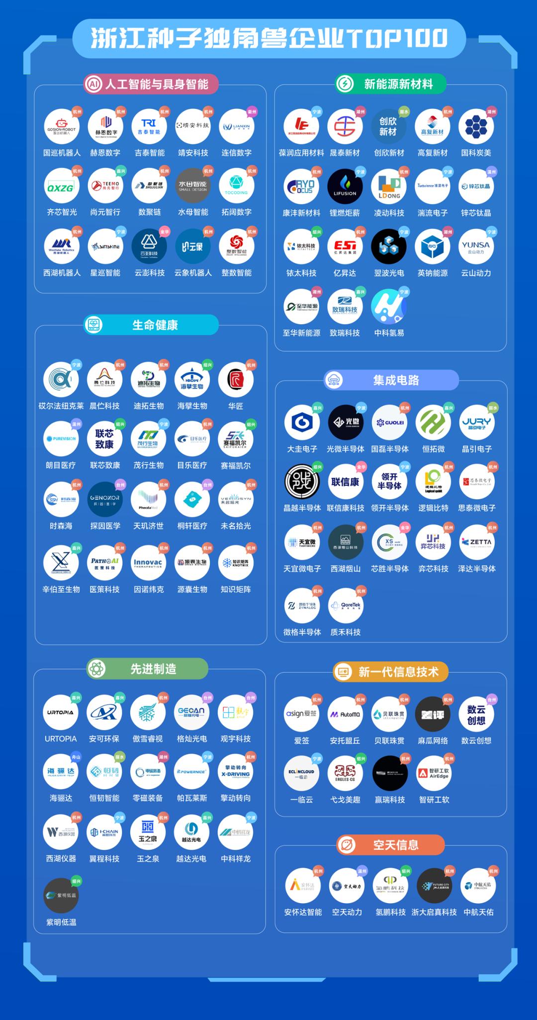在浙江省未来独角兽TOP100企业中,生命健康领域23家企业数量位居榜首,集成电路领域21家企业,排列第二,先进制造领域16家企业,人工智能与具身智能领域14家企业,新一代信息技术和新能源材料领域各13家企业,