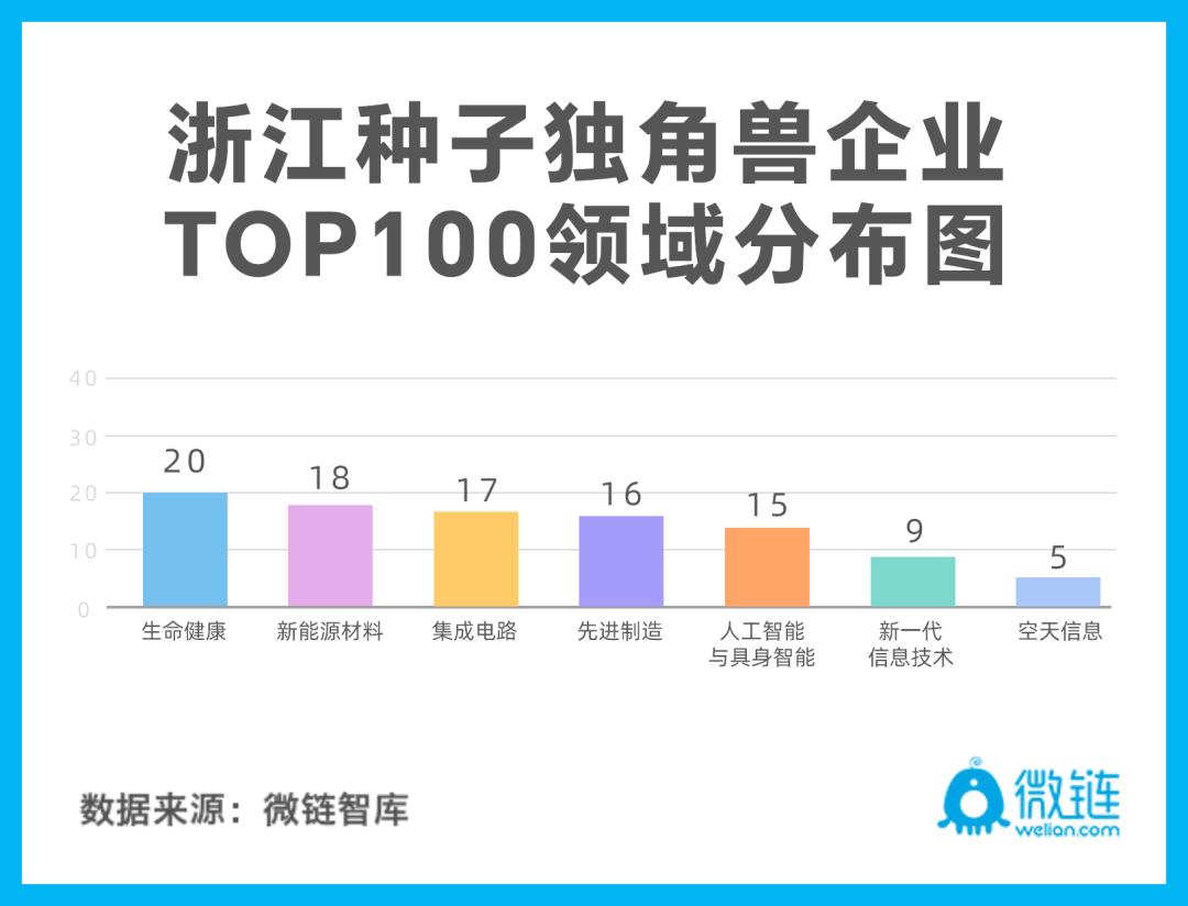 在浙江省种子独角兽TOP100企业中,前五名领域数量较平均,生命健康领域仍以20家位居榜首,新能源新材料领域18家,排列第二,集成电路领域17家,排列第三,先进制造领域16家,排列第四,人工智能与具身智能领域15家,新一代信息技术领域9家,空天信息5家。