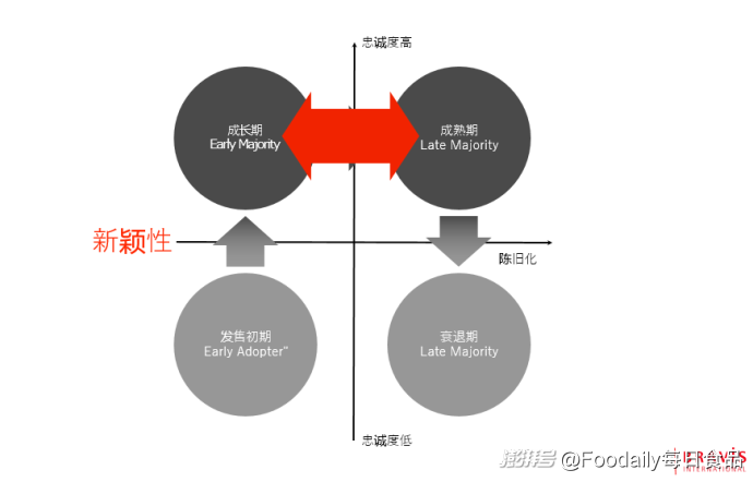 我们在品牌战略和市场营销中常常考虑一个品牌的忠诚度循环问题,如果品牌停留在成熟期而缺乏新颖性,消费者便可能转向竞争对手;而通过不断注入新元素,让品牌在成长期和成熟期之间游走,就能保持持续的成长。