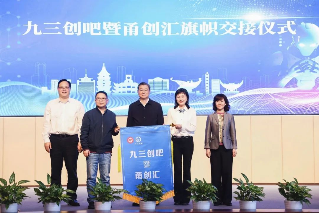 在叶正波、张立央、周培剑的见证下,社鄞州区基层委员会主委胡勤勇作为“之江同心 九三创吧”暨甬创汇活动的下一场协办组织代表接受了流动旗帜。