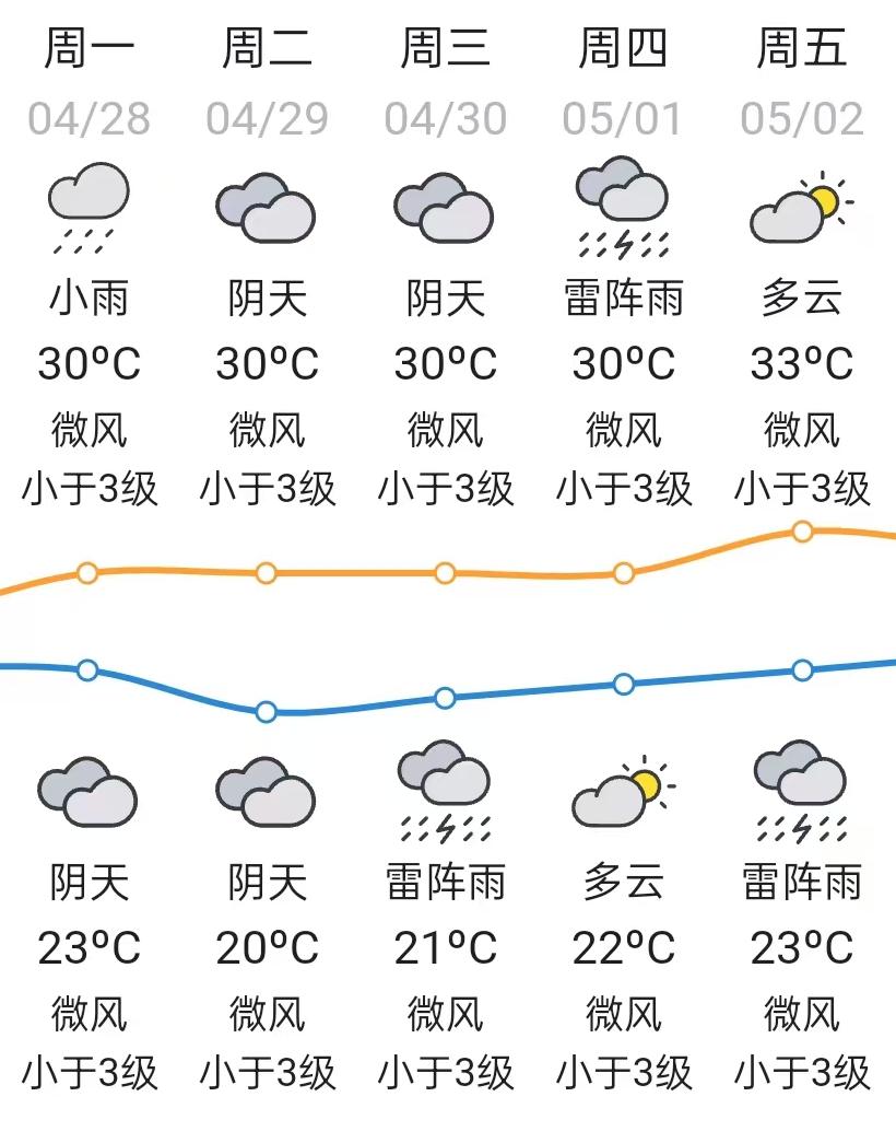 4月28日,受切变线影响,有雷阵雨局部大雨;4月29-30日,弱冷控制,以多云为主。