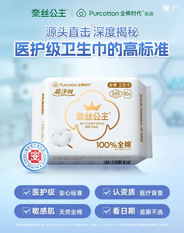 稳健医疗拥有先进的棉纤维检测仪器与严格的棉纤维进料检测流程,仅精选优质棉材料投入卫生巾生产。得益于用棉标准严格,“奈丝公主”卫生巾能够做到巾身及护翼部分均为100%全棉,为消费者带来更加安心舒适的使用体验。专家团中的孙旖(Jojo)医生也表示,这样的设计不仅过敏率更低,对敏感人士友好,棉花的良好透气性也让消费者在使用上会更加舒适。此外,棉优秀的吸湿性能,在“奈丝公主”最新的第六代干爽科技加持下,让产品在防漏的同时更能维持干爽,全面提升使用体验。