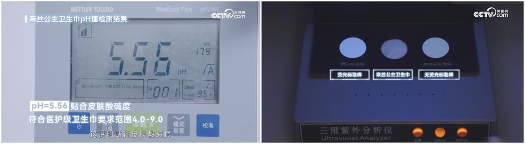 对于PH值及荧光剂添加情况,夏迪在现场也进行了一一检验。结果显示,“奈丝公主”卫生巾PH值为5.56,与人体私处皮肤环境十分接近;在专业的检测仪器下,“奈丝公主”卫生巾可迁移性荧光物质指标也符合标准。