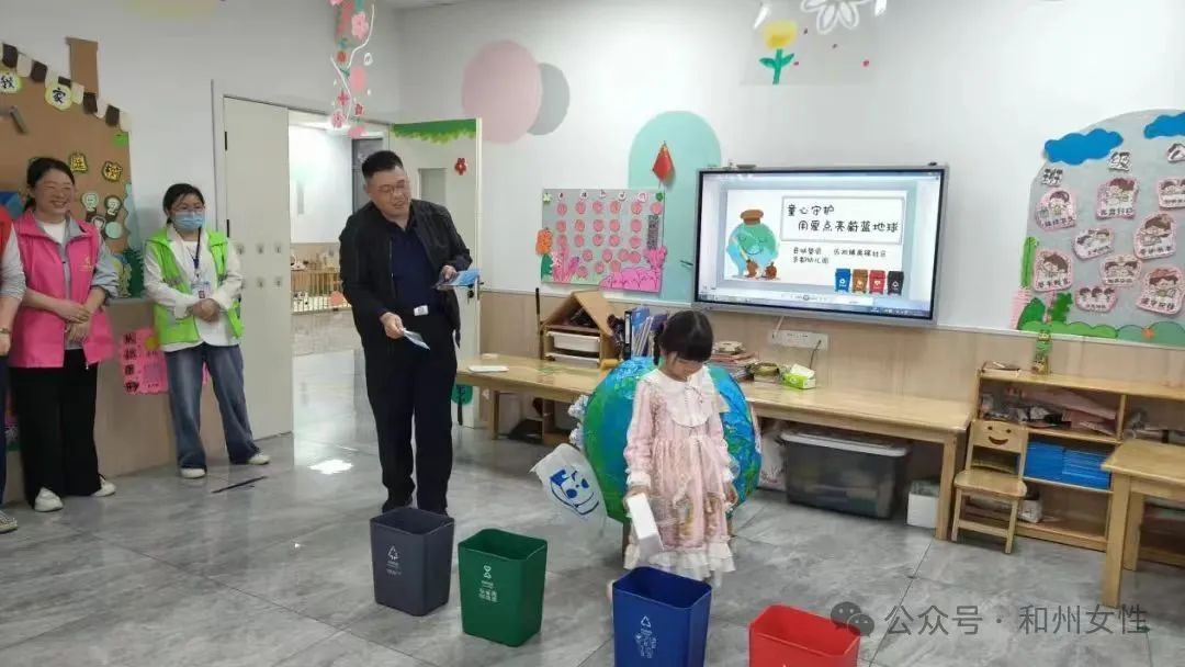 通活动中,巾帼志愿者通过图片展示引导孩子们认识环境污染问题,学习垃圾分类知识,并开展趣味知识问答。孩子们踊跃举手回答问题,让孩子们在欢乐中巩固垃圾分类知识。随后,志愿者展示了一个布满了各种“垃圾”的“地球”模型,生动形象地展示了地球遭受污染的现状,孩子们积极参与“帮助地球清理垃圾”环节,认真地将垃圾从地球模型上取下,和县城管局工作人员耐心指导,帮助孩子们按照有害垃圾、可回收垃圾、厨余垃圾和其他垃圾进行分类投放,顺利完成清理与分类任务。
