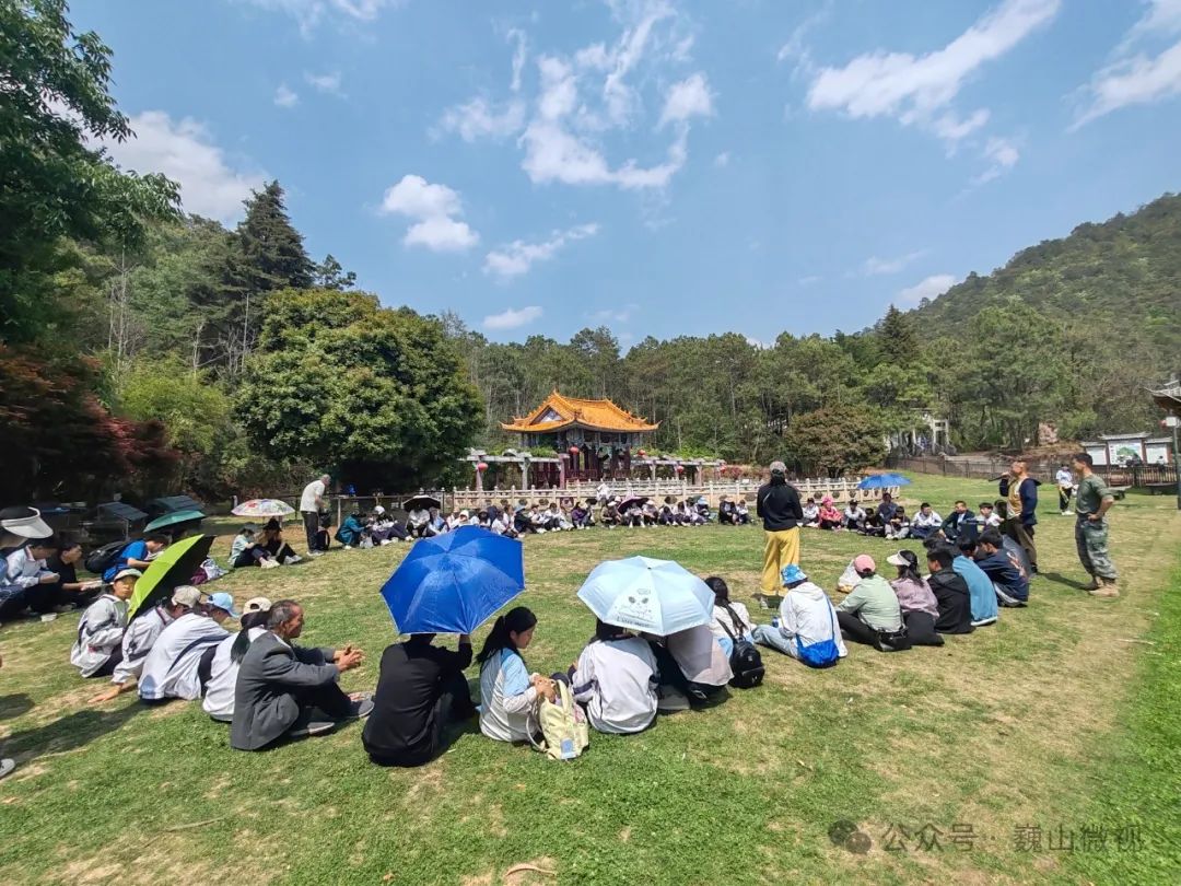 师生及家长瞻仰了南诏十三代王的丰功伟绩,追忆了南诏国的风土人情,欣赏了“万顷松涛”“龍池烟柳”“山茶流红”美景,感受春的气息。通过徒步健身、诗歌朗诵、文艺表演、亲子互动等活动,进一步弘扬爱国主义精神,增强地方特色教育,加强师生家长爱党、爱国、爱家的情怀。据了解,巍宝山南诏土主庙自1999年12月被中共云南省委员会、云南省人民政府授予云南省爱国主义教育基地以来承载着传承历史文化、弘扬民族精神的重要使命。充分发挥基地的教育功能,持续深化青少年爱国主义教育,我县多所学校积极组织师生前往参观学习。巍山县文化旅游投资开发有限责任公司全力做好全县师生入园参观保障服务工作,开通专属绿色通道,2025年1至4月接待并进行门票减免县内师生共11场次,3546人,让爱国主义精神深入人心。