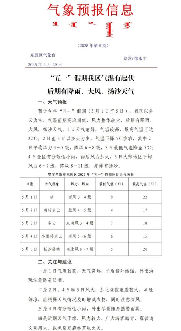 (东胜区气象台)原标题:《出行注意!东胜“五一”假期天气→》