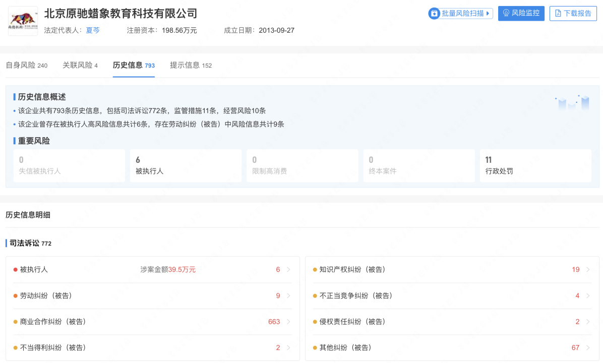 根据企查查提供的公开资料显示,北京尚德在线教育科技有限公司成立于2013年,该公司以在线教育为主的职业培训机构,提供如自考等学历类培训、职业资格证书培训与职业技能培训服务,采用直播+配套资料的模式开展业务。企业于2022年6月20日更名为“北京原驰蜡象教育科技有限公司”,该公司历史行政处罚11次,涉及虚假商业宣传、虚构价格等方面,因“学费退款却要扣除25%注册费”等相关问题被约谈。