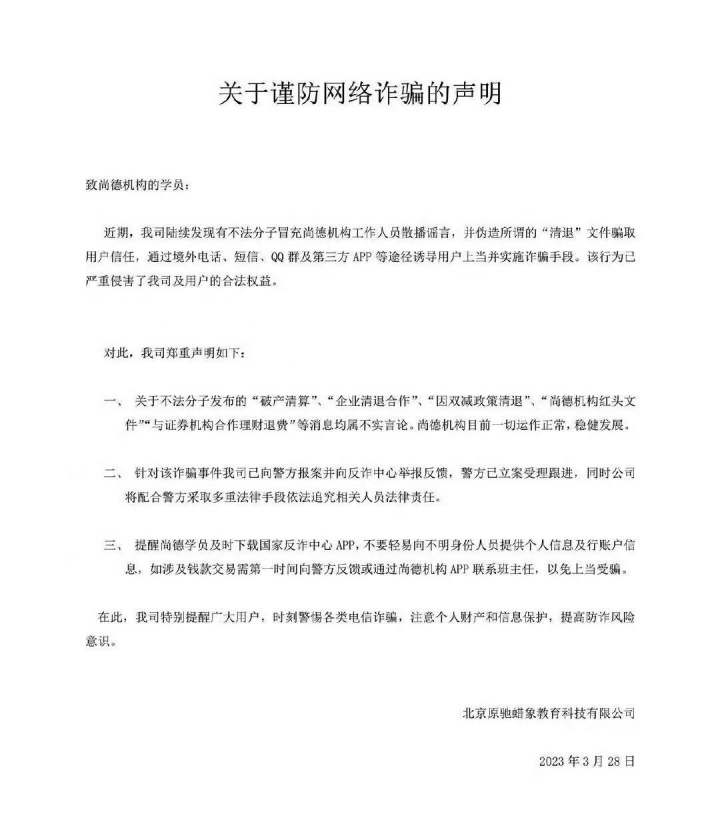 记者根据近期消费者反馈的情况联系北京原驰蜡象教育科技有限公司,有关工作人员称公司2023年就已发布防骗声明。记者在其官方微博看到,该企业于2023年发布一则名为“关于谨防网络诈骗的声明”中提到:企业陆续发现有不法分子冒充尚德机构工作人员散播谣言,并伪造所谓的“清退”文件骗取用户信任,通过境外电话、短信、QQ群及第三方APP等途径诱导用户上当并实施诈骗手段。
