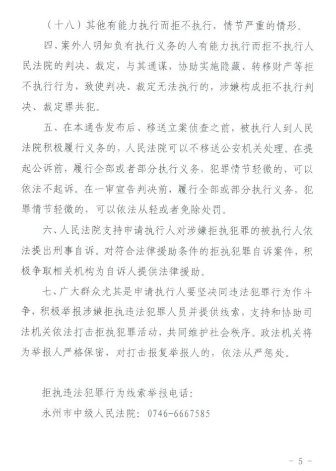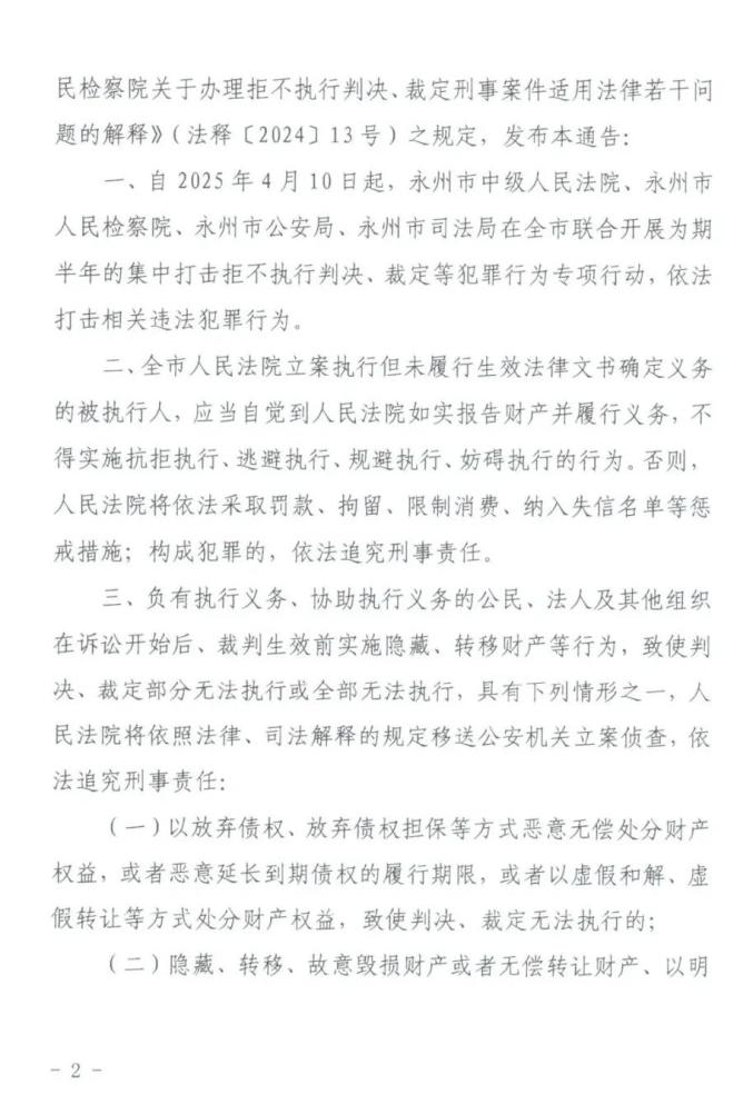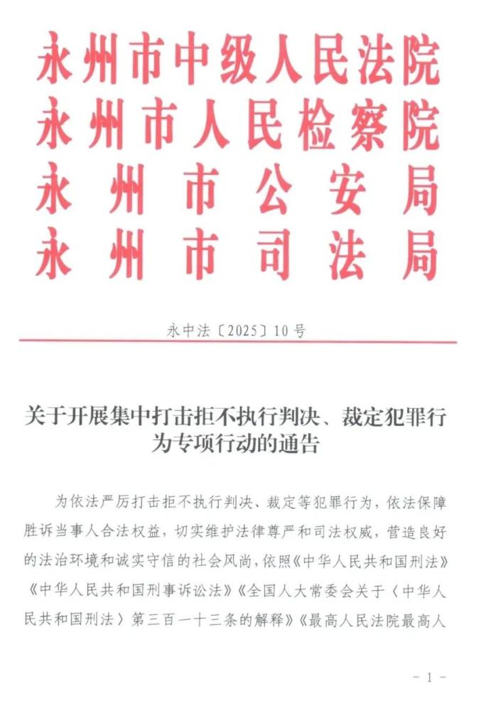 一、自2025年4月10日起,永州市中级人民法院、永州市人民检察院、永州市公安局、永州市司法局在全市联合开展为期半年的集中打击拒不执行判决、裁定等犯罪行为专项行动,依法打击相关违法犯罪行为。