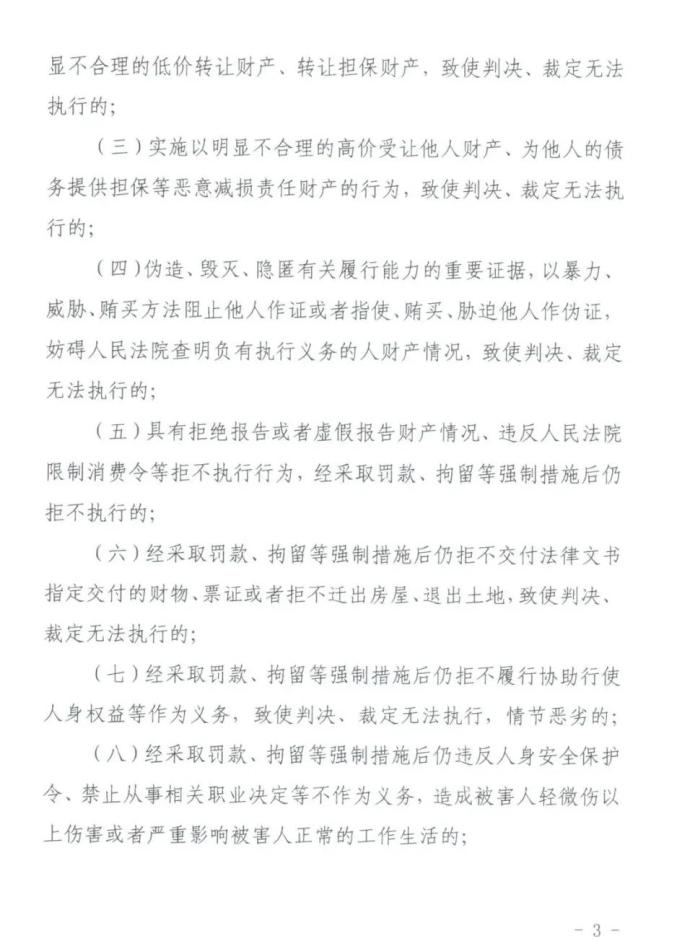 三、负有执行义务、协助执行义务的公民、法人及其他组织在诉讼开始后、裁判生效前实施隐藏、转移财产等行为,致使判决、裁定部分无法执行或全部无法执行,具有下列情形之一,人民法院将依照法律、司法解释的规定移送公安机关立案侦查,依法追究刑事责任: