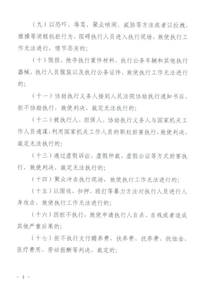 (九)以恐吓、辱骂、聚众哄闹、威胁等方法或者以拉拽、推搡等消极抗拒行为,阻碍执行人员进入执行现场,致使执行工作无法进行,情节恶劣的;