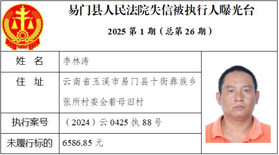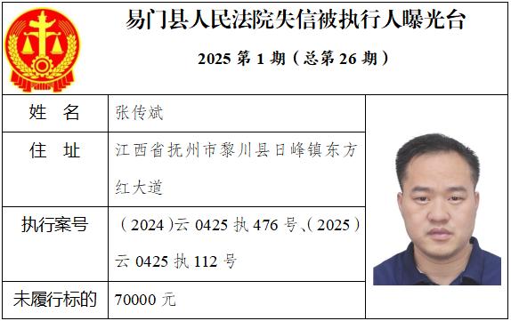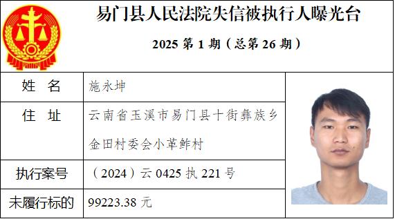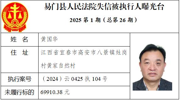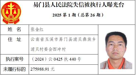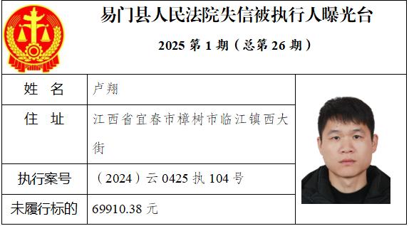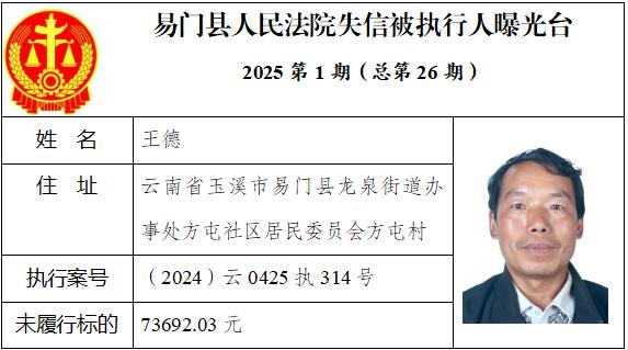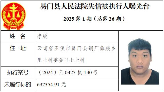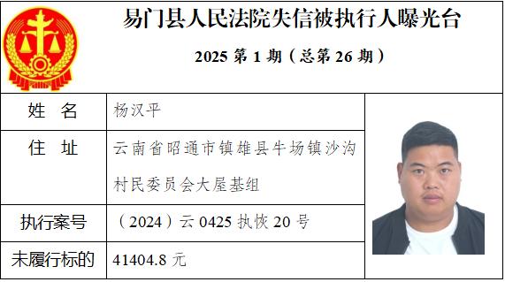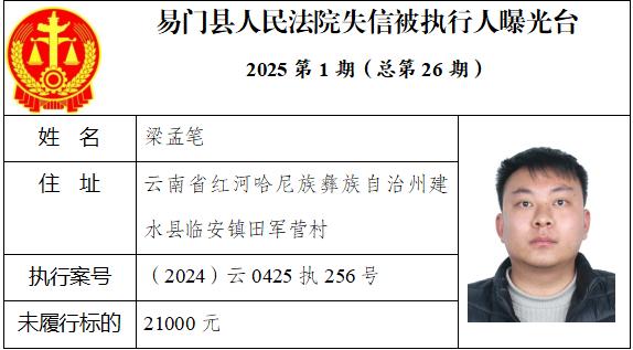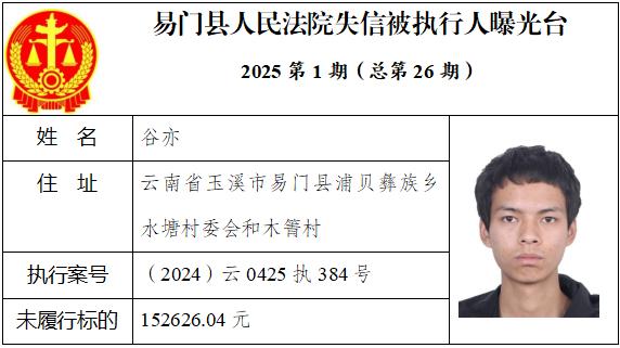 易门县人民法院关于发布失信被执行人名单的公告 (2025)第1期(总第26期)