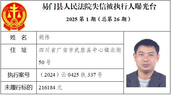 亲爱的读友,本期为易门法院官方微信2025年第42期内容原标题:《易门县人民法院关于发布失信被执行人名单的公告 (2025)第1期(总第26期)》