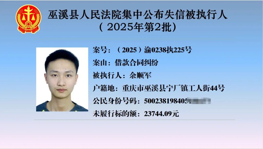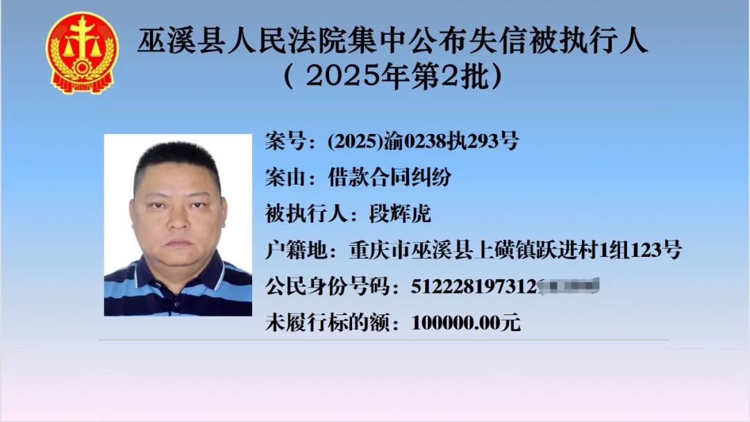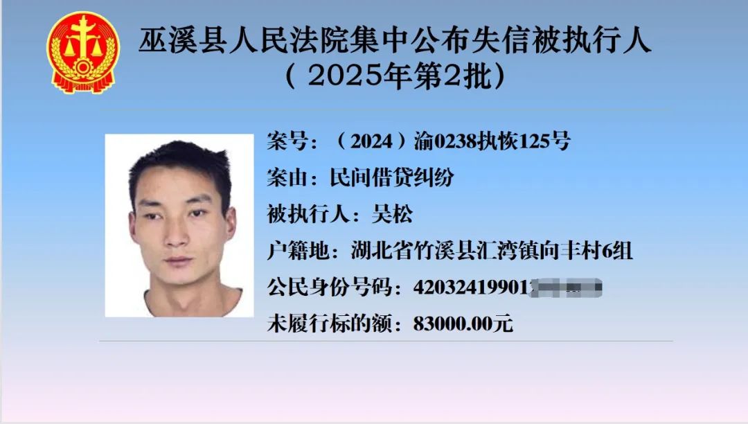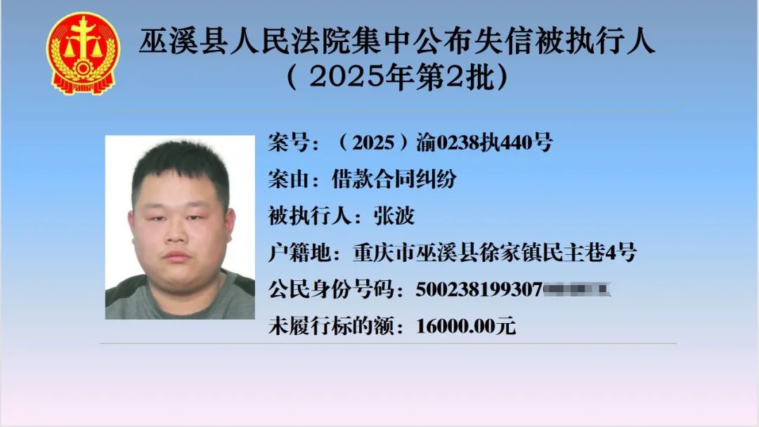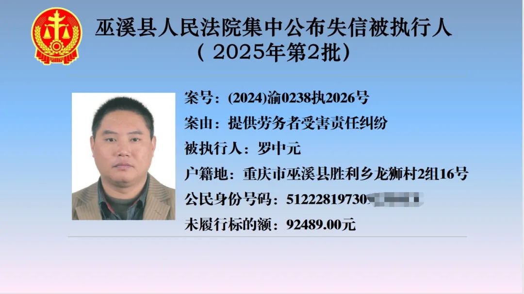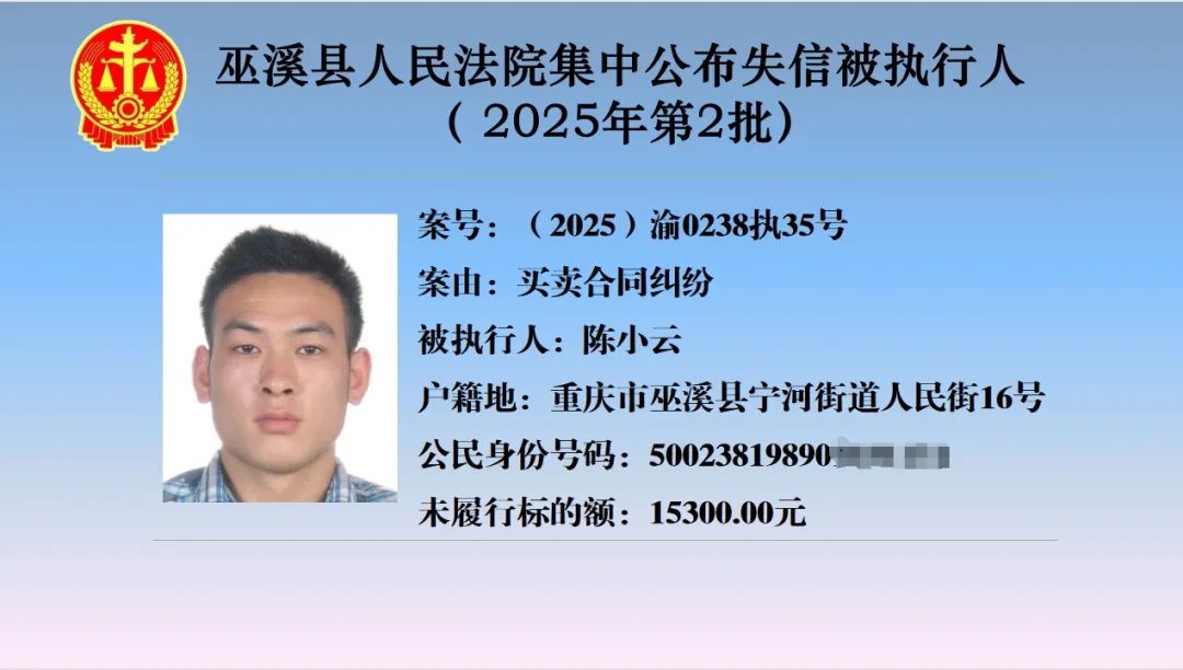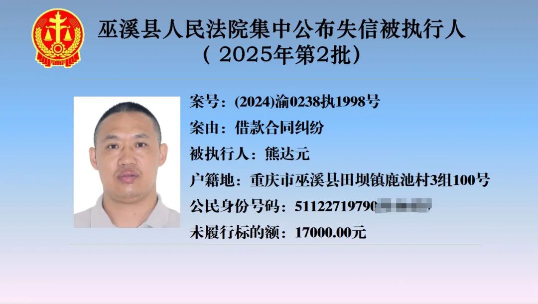 原标题:《巫溪法院 || 实名曝光!这17名被执行人失信!(2025年第二批)》