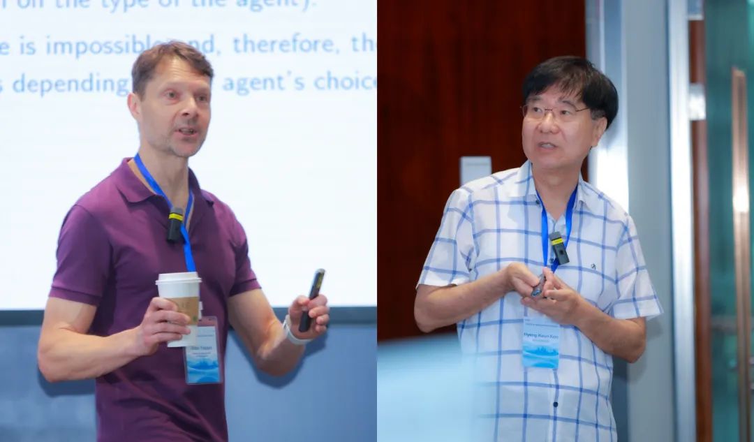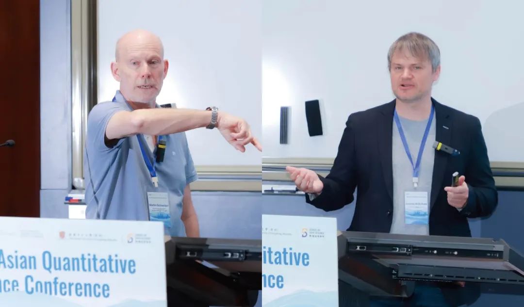 左起:Martin Schweizer、Johannes Muhle-Karbe在主旨演讲环节,苏黎世联邦理工学院Martin Schweizer教授介绍了论文《收益独立分布条件下的动态单调均值方差投资组合优化》(Dynamic Monotone Mean-variance Portfolio Optimisation with Independent Returns)。单调均值方差(MMV)效用是对经典Markowitz效用的改进,它确保效用是关于投资组合最终价值的单调递增函数。Schweizer教授基于之前的工作,给出了收益分布独立的资产价格模型中MMV效用的最优动态投资组合选择问题的完整的显式解。这个解仅假设在资产价格的半鞅模型中收益是独立分布的,且不存在局部的弱套利,因此具有普遍的适用性。