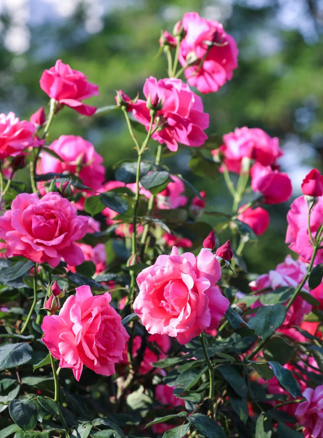 上海植物园在南北区均栽培有月季,其中,北区的月季和藤蔓植物进行了搭配布置。南区则建有专门的月季园,以现代月季的演化历史为主线,设置了多个展示区域,像月季演化区、月季主要分类展示区、中国古老月季区、国内新优月季区、香味月季区、多彩月季区等,还设有藤本廊架、树桩月季等展示类型,构建出高低错落的景观。