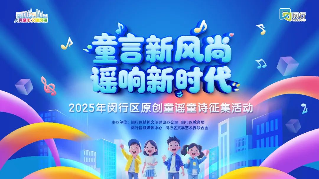 为深入学习宣传习近平文化思想,坚持不懈用习近平新时代中国特色社会主义思想凝心铸魂,深化“扣好人生第一粒扣子”思想道德教育实践活动,增强未成年人的“四个自信”,丰富未成年人精神文化生活,创作富有时代新风尚新风貌、符合社会主义核心价值观、适合未成年人传唱展演的童谣童诗作品,区精神文明办、区教育局、区融媒体中心、区文联开展“童言新风尚 谣响新时代”2025年闵行区原创童谣童诗征集活动。
