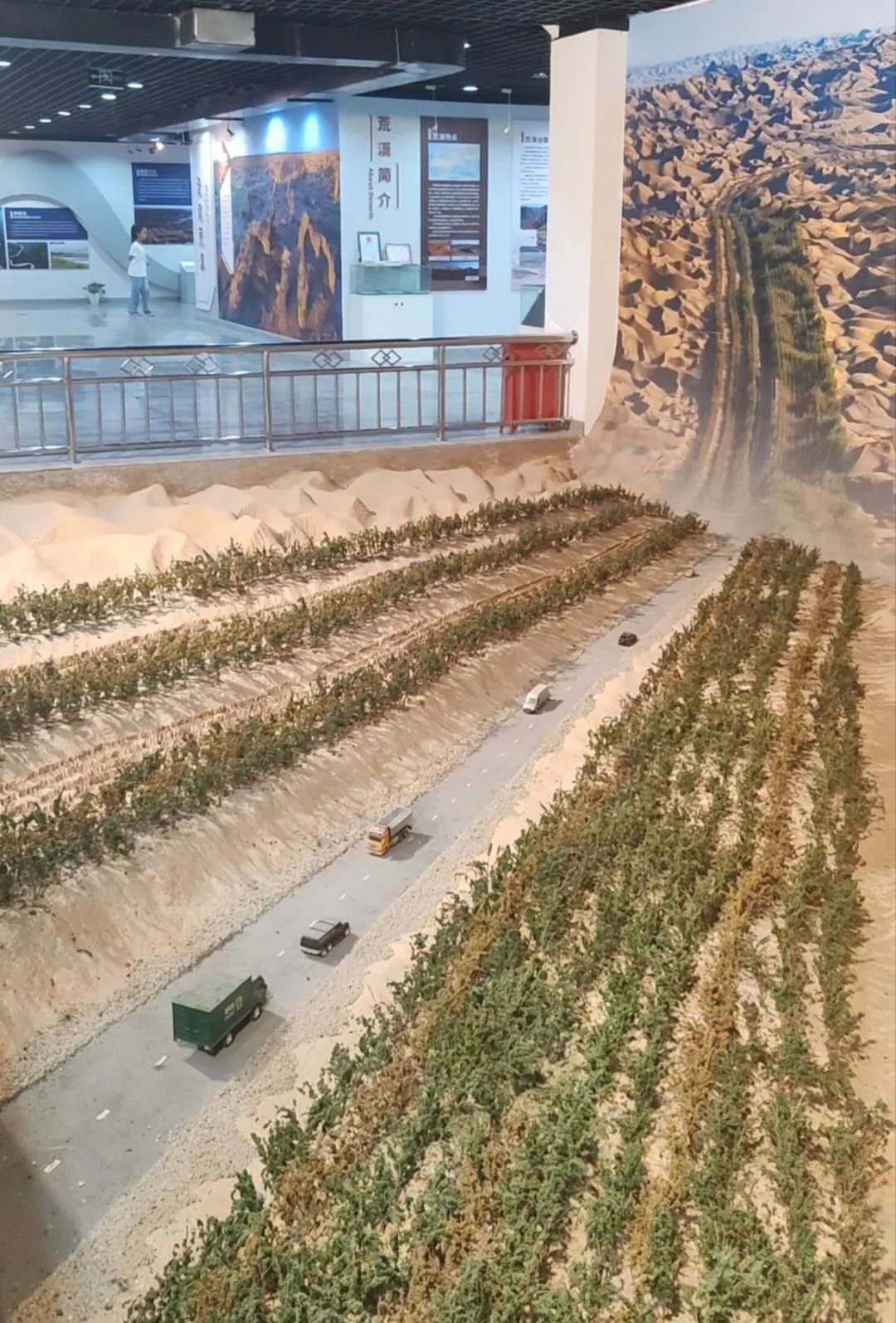 在新疆自然博物馆中,还展示了科研人员防沙治沙的重要成果,其中最引人注目的就是沙漠公路的大型沙盘模型。1995年,塔克拉玛干沙漠公路建成,是当时世界上最长的沙漠公路。2006年,中国科学院新疆生态与地理研究所牵头完成了436公里的全线绿化,共种植了2000多万株荒漠植物,防护林宽72米到78米。这条沙漠中的“绿色丝带”不仅为沙漠增添了生命的气息,也日夜守护着公路畅通无阻。