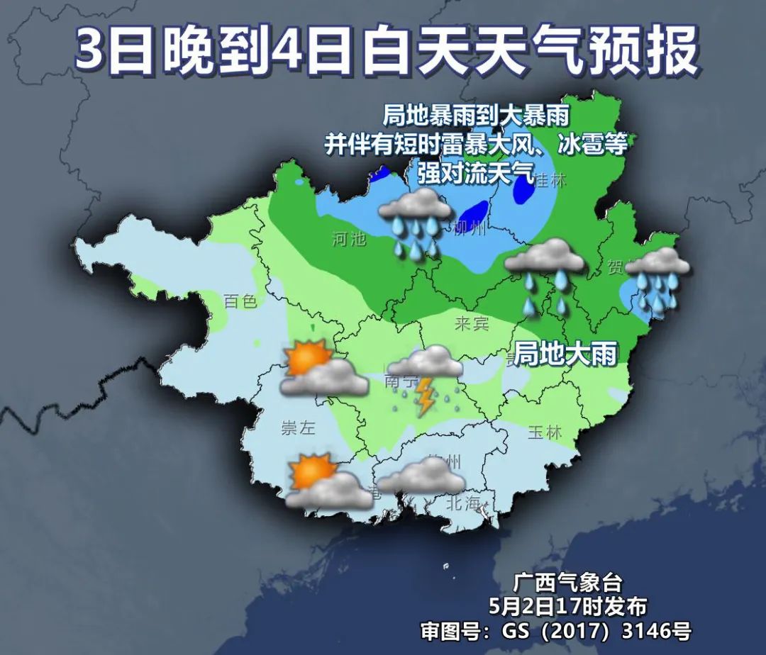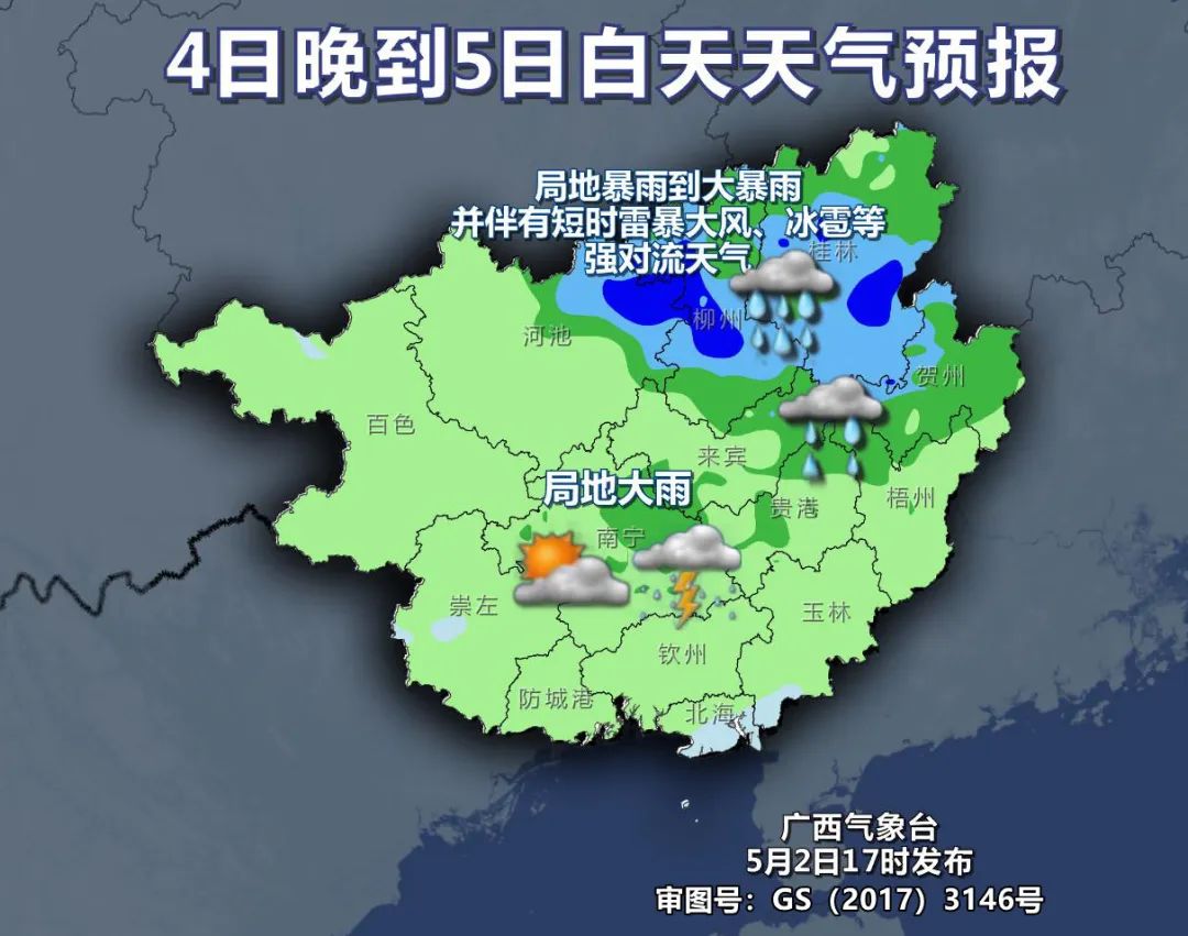 3日晚上到5日白天,桂北部分地区有中到大雨、局地暴雨到大暴雨并伴有短时雷暴大风、冰雹等强对流天气,其它地区多云间阴天有阵雨或雷雨、局地大雨。6日,全区阴天有阵雨或雷雨、局地中到大雨。各地气温:桂北20~36℃,桂南24~34℃。