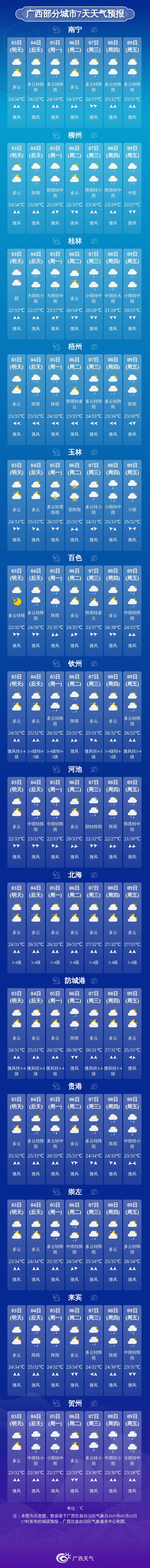 今天晚上到明天白天,全区多云到晴,其中桂林、贺州、梧州、玉林、贵港、南宁、防城港、钦州、北海等市局地有阵雨。南宁市:今天晚上到明天白天多云间晴,偏南风2级,最低气温24℃,最高气温34℃。