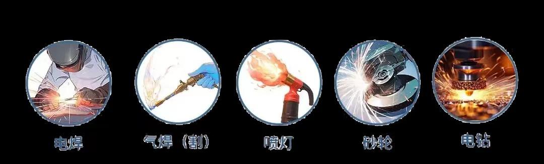 动火作业是指在直接或间接产生明火的工艺设施以外的禁火区内从事可能产生火焰、火花、炽热表面的非常规作业,包括电焊、气焊(割)、喷灯、电钻、砂轮、喷砂机等。常见类型有: