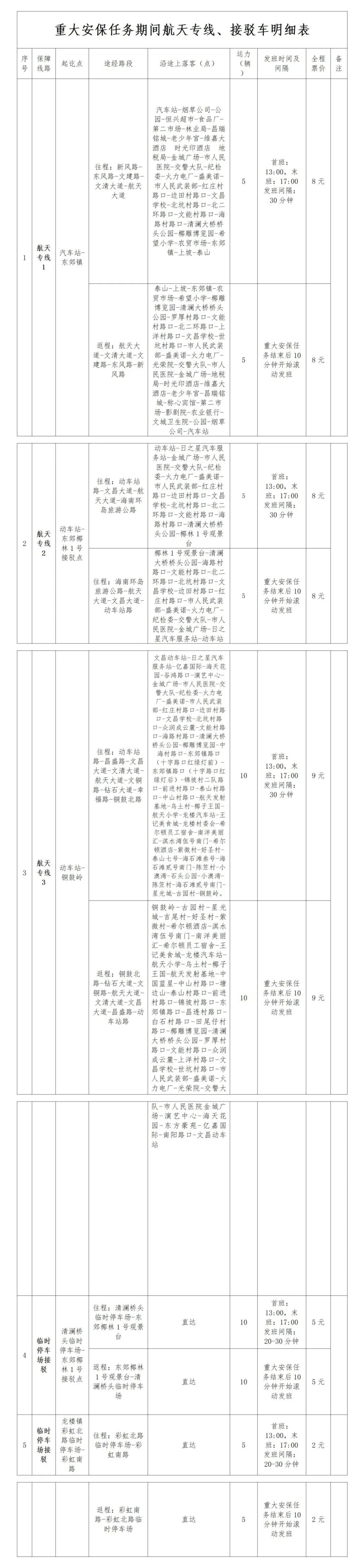 航天专线、临时停车场接驳信息为确保重大安保任务期间东郊镇、龙楼镇道路交通安全畅通,有效缓解交通压力,文昌市交通运输局分别在文昌汽车站、动车站开通三条航天专线,其中专线1、专线2(汽车站-东郊镇、动车站-东郊椰林1号接驳点)全程票价8元,专线3(动车站-铜鼓岭)全程票价9元。如需前往的游客和市民可在各点位乘坐专线车抵达东郊镇、龙楼镇,返程上车点即为往程下车点。