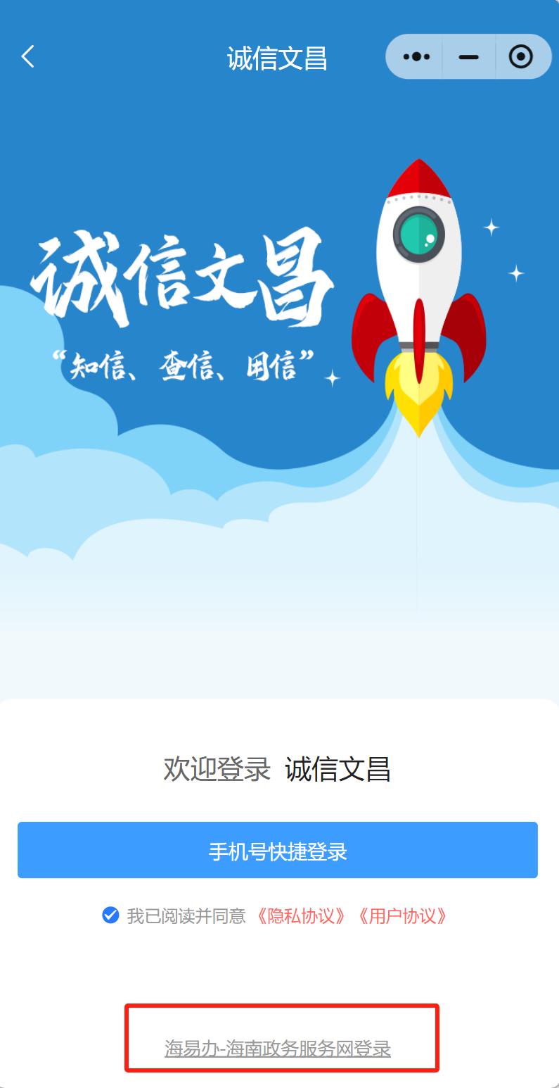 3.如微信绑定手机号尚未在海易办注册,点击页面下方“海易办-海南政务服务网登录”按钮,保存二维码图片,使用微信/支付宝/海易办APP扫码完成授权注册后,返回“诚信文昌”小程序,按照上述流程进行手机号快捷登录。