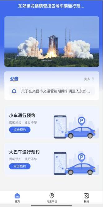 4.登录成功后,进入车辆通行预约平台,在“首页-车辆通行预约”模块,按照车辆类型,选择小车预约通行/大巴车通行预约按钮进入预约页面,选择“东郊镇管控区域/龙楼镇管控区域”进行预约。