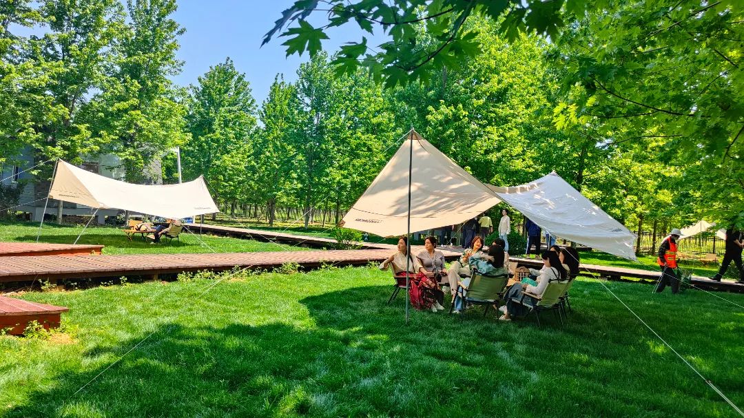 在同心湖周边,一顶顶帐篷点缀在开阔草地上,人们席地而坐、闲话家常,与满园春色相映成趣。