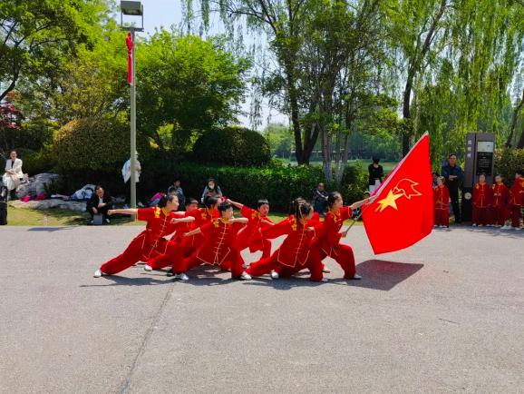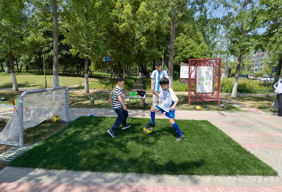 桃花岛公园的运动嘉年华掀起全民健身热潮:北门处,孩子们在教练指导下练习足球;六保塔附近,习武者动作刚劲有力。
