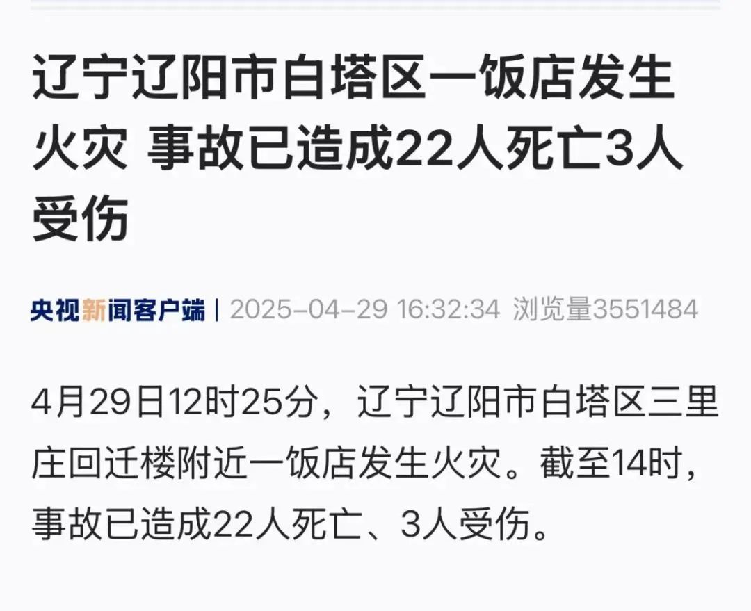 据央视新闻消息,4月29日12时25分,辽宁辽阳市白塔区三里庄回迁楼附近一饭店发生火灾。截至14时,事故已造成22人死亡、3人受伤。