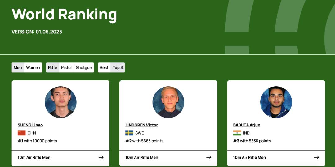 5月1日,国际射联发布了男子十米气步枪最新积分和排名,苏州健儿盛李豪登顶世界第一,积分达到10000分,断崖式领先第二名4337分,也是12个射击单人项目里唯一五位数的选手。(详情)