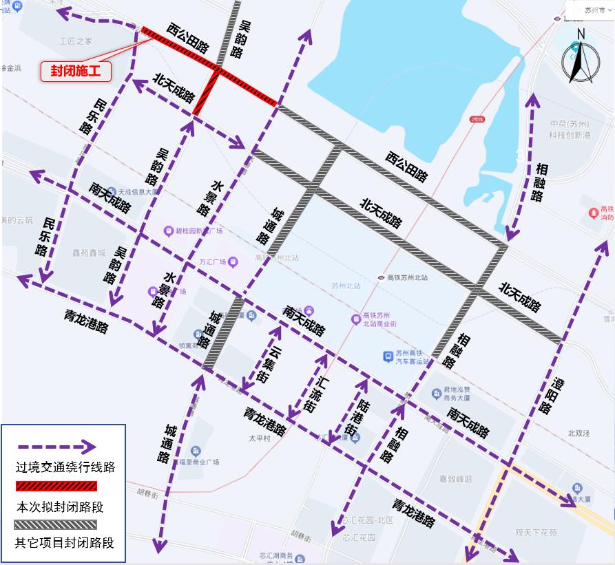 为保障高铁苏州北站综合枢纽扩容期间市政道路建设,自2025年5月7日至2027年11月30日起对西公田路(民乐路-水景路)、吴韵路(西公田路-京沪高铁)、北天成路(民乐路-水景路)分阶段封闭施工。(详情)
