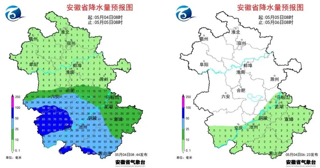 据安徽省气象台预报,4日夜里至5日我省有一次较明显降水过程,主要降水时段发生在4日夜里,江淮之间南部和江南部分地区大雨,局部(安庆、池州、黄山市)暴雨(50~80毫米),并伴有雷电、短时强降水等强对流天气。7日夜里至9日白天和13日我省分别有一次降水过程,其中8日沿江江南部分地区中雨。