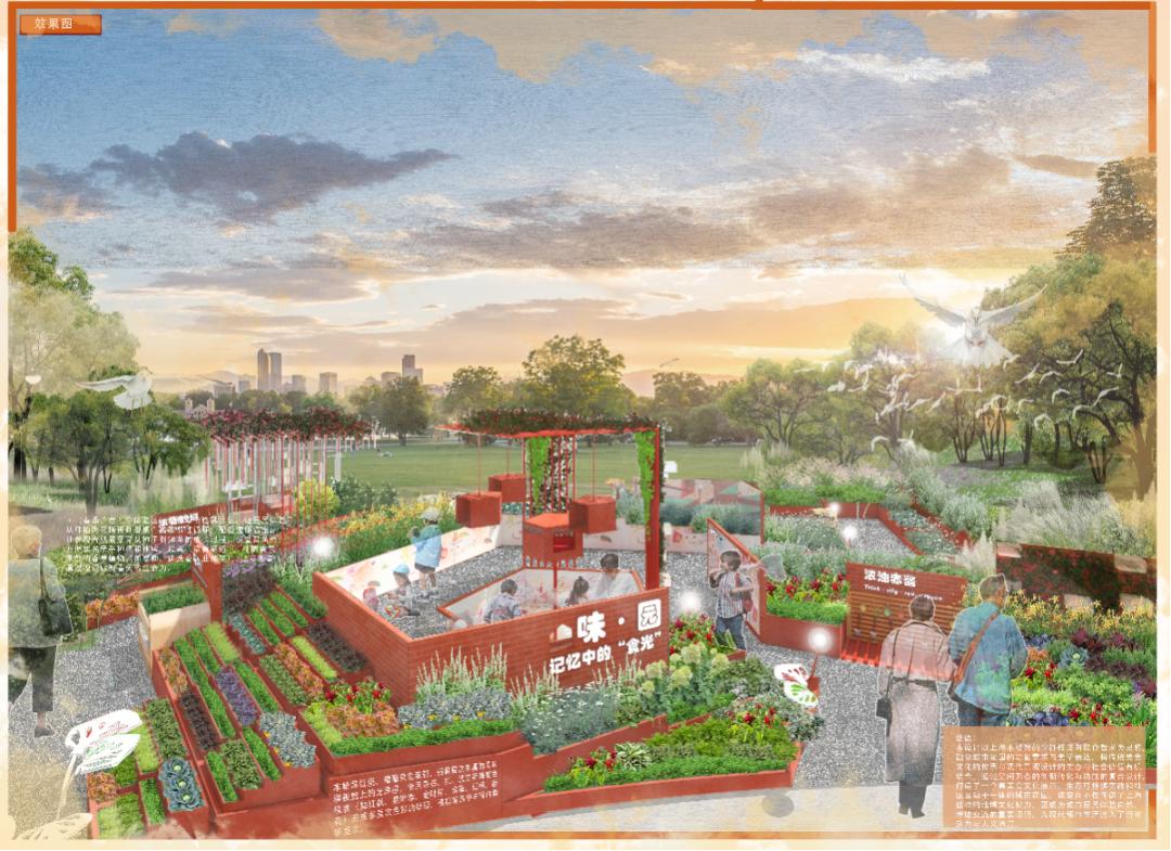 方案生成方案生成:从上海本帮菜的烹饪技法和特有的饮食哲学中归纳出五个特色:浓油赤酱、清炒慢炖、用料广泛、器具雅致、不时不食。打造了一个集美食文化传承、生态可持续理念传播和科普互动于一体的社区花园。花园在中心区设置互动交流休息平台,通过环形的游览路线串联起各个种植区,以高低错落的方块阶梯塑造层次感。