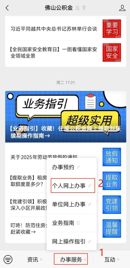 1.登录“佛山公积金”微信公众号,在微信菜单栏中找到“办事服务”,点击进入“个人网上办事”菜单。