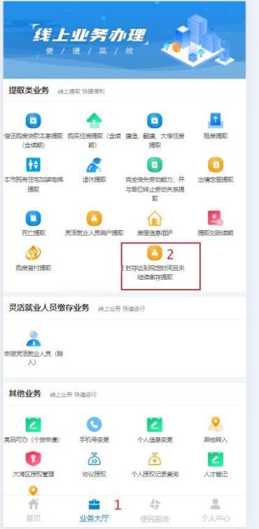 2.首页点击业务大厅,点击“封存达到规定时间且未继续缴存提取”-“我要提取”,阅读并同意《提取承诺(授权)声明》,进入申报页面。如图: