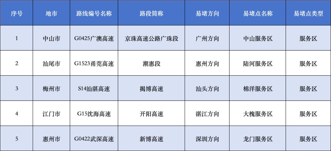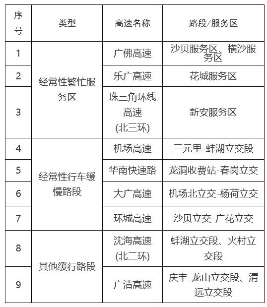 经与广东省交通运输厅联合研判,今年广东省“五一”期间较为拥堵的路段、车流繁忙服务区、充电繁忙服务区有以下几处:
