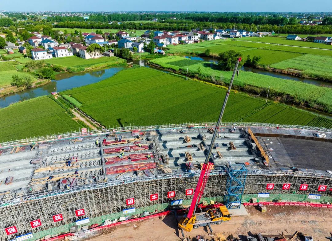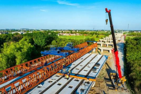 经过广大建设者的奋力推进,当前东台段全线结构物施工已进入尾声,钻孔灌注桩、水泥搅拌桩、承台、小型结构物、钢桁梁架设等全部完成,墩柱、系梁、盖梁完成98%以上,空心板梁安装、预制箱梁安装均超70%,现浇箱梁完成90%,全线关键节点之一的通榆河大桥已完成节段近90%,正在冲刺合龙。