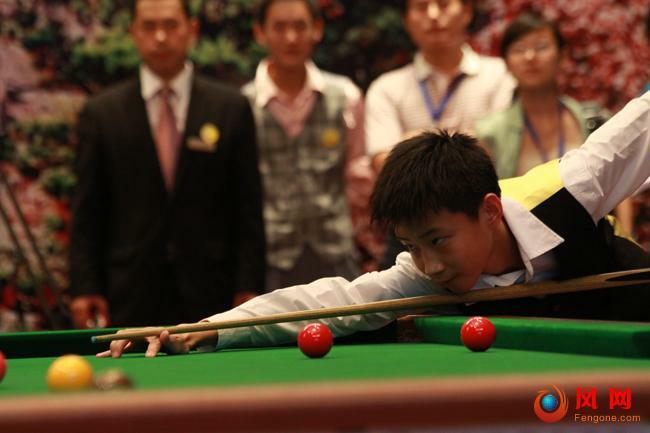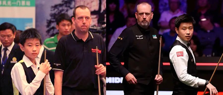 左:2011年张家界表演赛上,14岁赵心童和马克·威廉姆斯