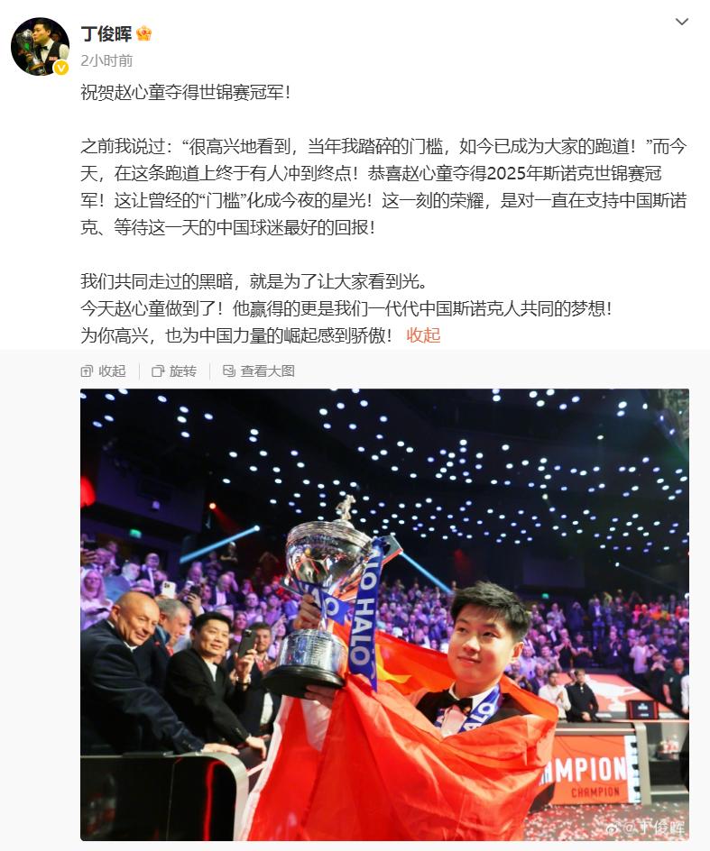 赵心童夺冠后,丁俊晖第一时间发微博祝贺。他表示:“今天赵心童做到了!他赢得的更是我们一代代中国斯诺克人共同的梦想!为你高兴,也为中国力量的崛起感到骄傲!”