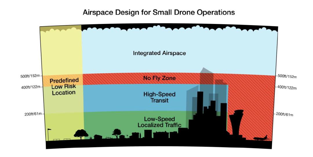 垂直维度的分层结构。可基于空域高度,结合飞行器速度条件和飞行器执行的具体功能进行分层。例如亚马逊公司将城市上空的低空空域分为不同层次,将200英尺以下(约60米)的空域区域主要进行低速局部交通,将保留给测量、录像和检查等低空作业,以及没有复杂的感知和规避技术的小型无人机;200至400英尺(约60至120米)的空域区域主要进行高速运输,适用于感知和规避设备齐全的小型飞行器;400至500英尺(约120至150米)将作为永久性禁飞区,除紧急情况外不得在该区域飞行。该空域设计模型还将包括预先设定的低风险地区,例如某些航空研究机构。国内研究者则提出构建“低高空—低中空—低低空”的城市低空空域分层系统,其中500米以下为“低低空”层,规划小微型无人机作业区,完成中心城区内部与郊区内部的末端物资运输;500至1000米为“中低空”层,设置重型货运无人机通道,执行机场、卫星城与中心城区间的货物转运;1000米至3000米为“高低空”层,部署飞行汽车等高速运输工具的专属空域,承担跨城市组团及邻近城市间的低空客运。