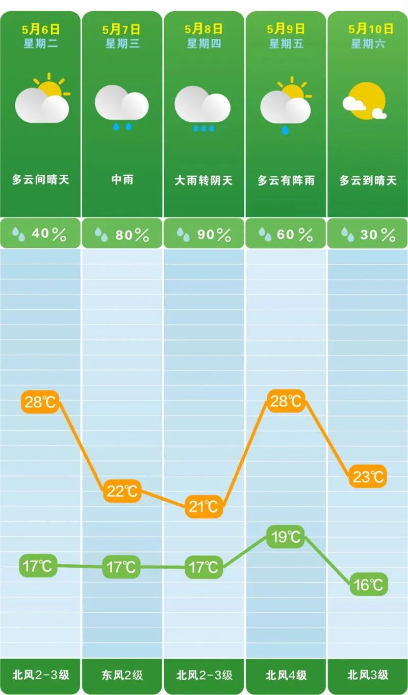 市气象台预计,5月6日长沙多云间晴天,17℃至28℃;7日到8日,长沙有一次较强降雨过程;9日到12日,槽后偏北气流控制,长沙晴天或多云为主。
