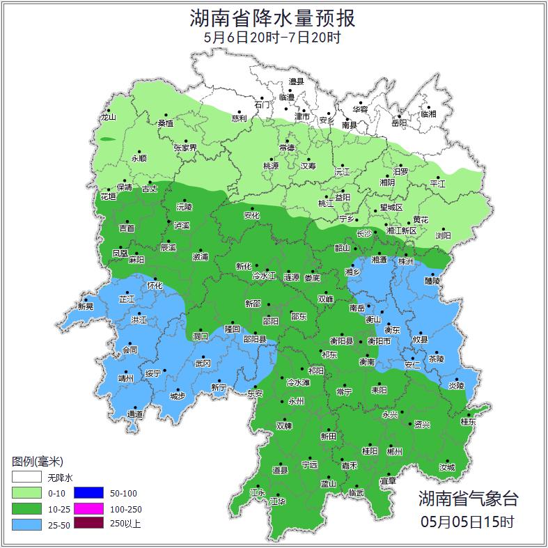 从湖南省整体天气情况来看,湖南省气象台预计,6日白天大部分地区以晴天到多云天气为主,6日晚到8日省内还将有一次强降雨天气过程,湘中、湘南有暴雨和大暴雨,并伴有短时强降水、雷暴大风等强对流天气。其中,6日早晨湘中部分地区有雾;7日晚上到8日白天,阴天有中到大雨,其中怀化、湘西州南部、长沙东部、湘潭东部、株洲、邵阳西部、衡阳东部、郴州北部部分地区有暴雨,怀化(市区、洪江、麻阳、新晃、芷江)、长沙(浏阳)、株洲(茶陵、醴陵、攸县)大暴雨,雷雨时局地阵风8到10级。