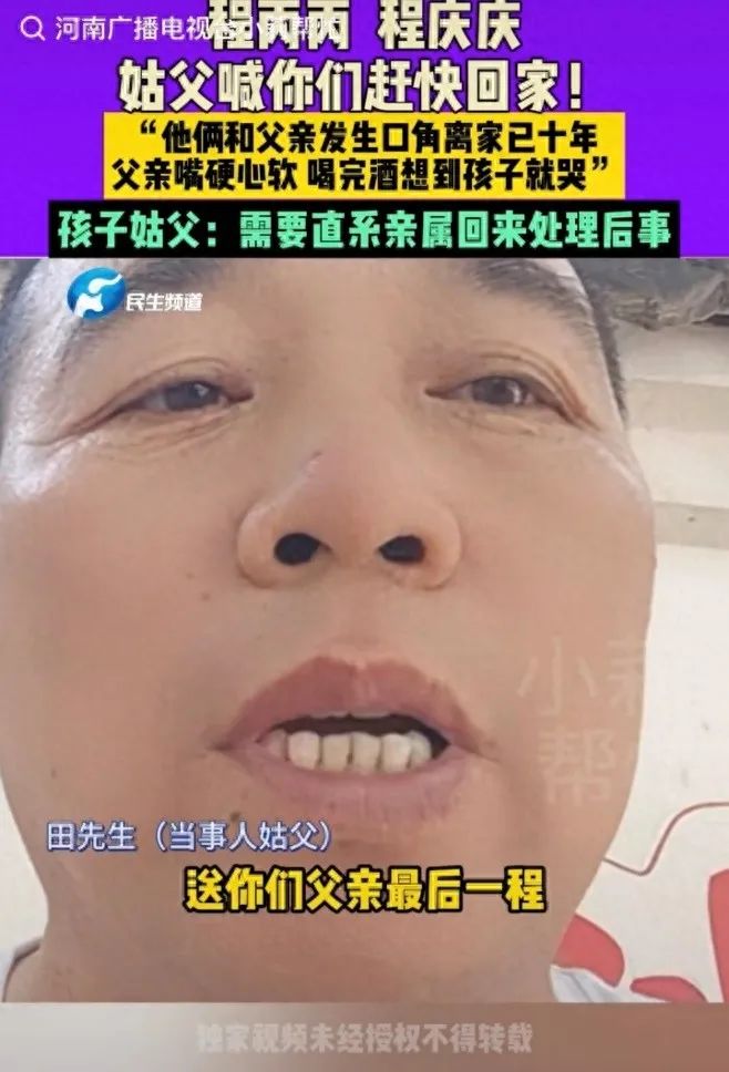 当事人姑父通过媒体喊话。图/河南广播电视台据河南广播电视台报道,4月30日上午9时许,程丙丙和程庆庆的父亲在工地因触电意外死亡,经协商,家属获赔56万。因其妻子早逝,家中无人处理后事,需两个儿子作为直系亲属签字处理后续事宜。