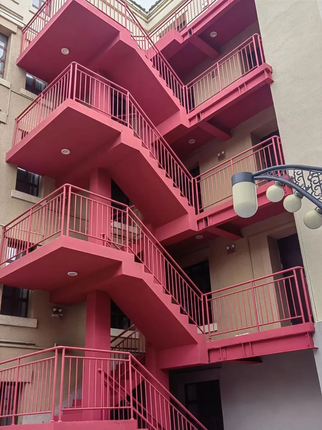 漫步在街市,随处一个拐角都超出片!一座醒目的红楼梯,蜿蜒向上,在这红楼梯上拍照打卡,复古工业风扑面而来。