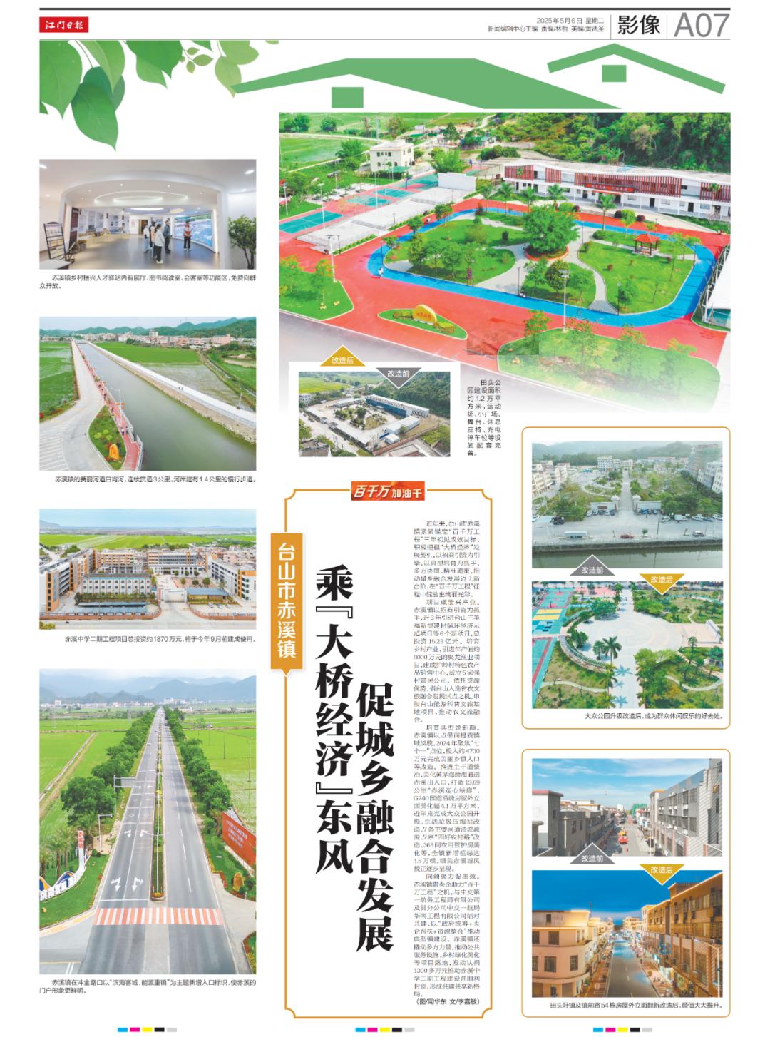 《江门日报》2025年5月6日 第A07版 影像近年来,台山市赤溪镇紧紧锚定“百千万工程”三年初见成效目标,积极把握“大桥经济”发展契机,以招商引资为引擎,以典型培育为抓手,多方协同、精准施策,推动城乡融合发展迈上新台阶,在“百千万工程”征程中绽放出绚丽光彩。