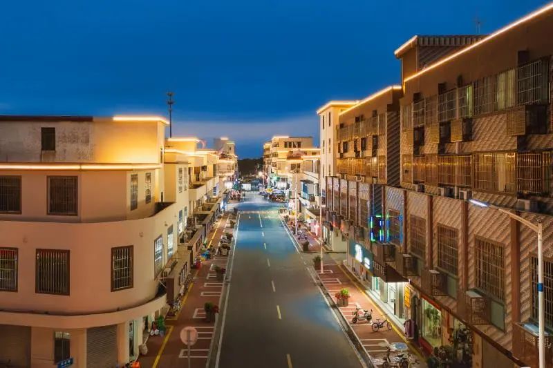 △华灯初上,人间灯火。田头圩镇及镇前路54栋房屋外立面翻新改造后颜值大大提升,窗户做了统一装饰,墙面进行了修缮,屋顶进行地域文化的色彩涂装,门店招牌统一进行了更新,空调外机采用富有客家文化元素的装饰。