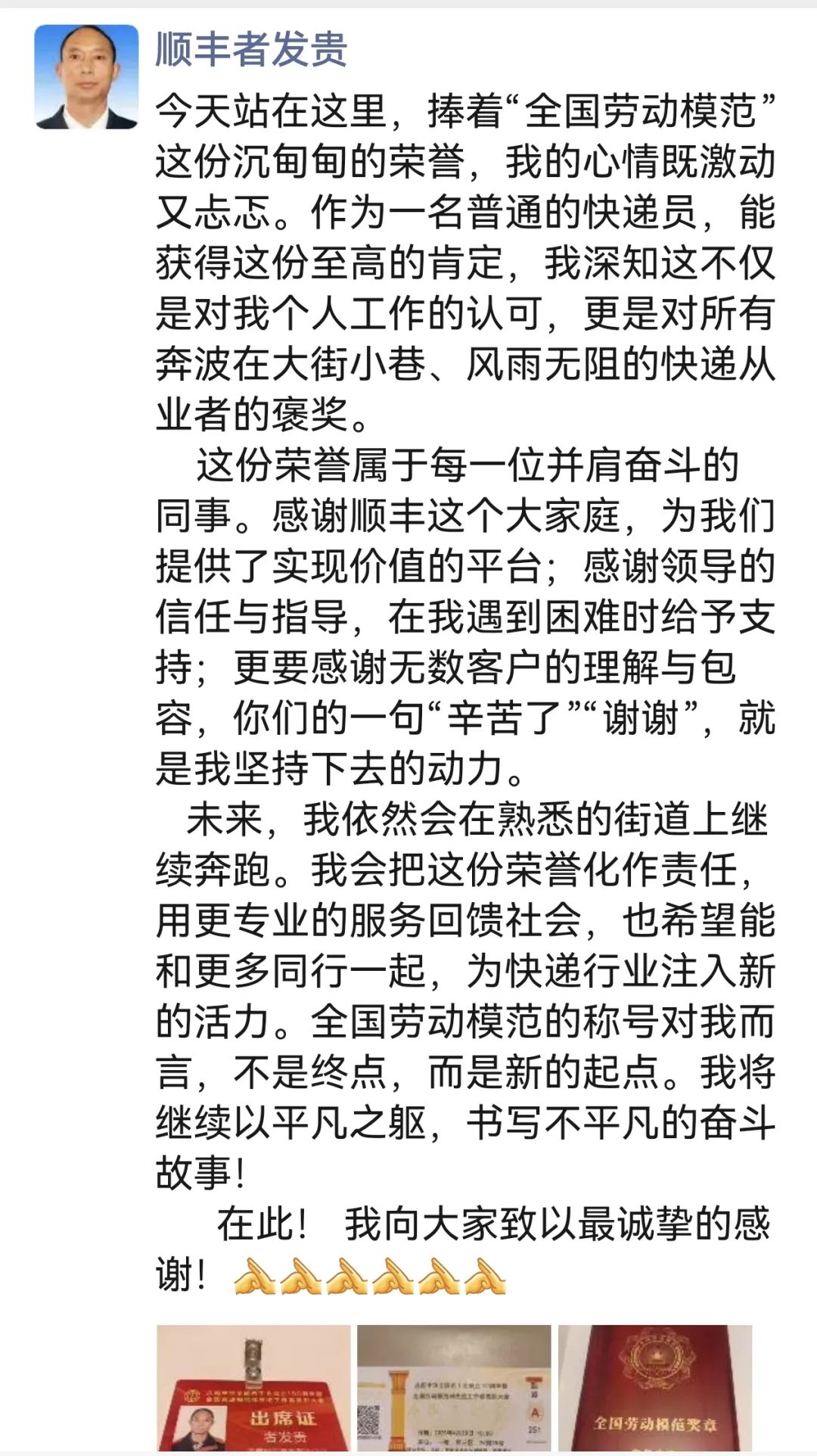 在获得表彰之后,者发贵发了一条特殊的朋友圈:“今天站在这里,捧着全国劳动模范这份沉甸甸的荣誉,我的心情既激动又忐忑。作为一名普通的快递员,能获得这份至高的肯定,我深知这不仅是对我个人工作的认可,更是对所有奔波在大街小巷、风雨无阻的快递从业者的褒奖,这份荣誉属于每一位并肩奋斗的同事。”